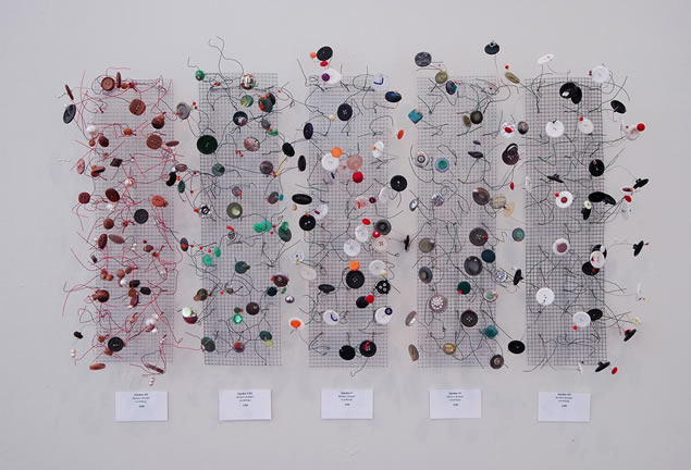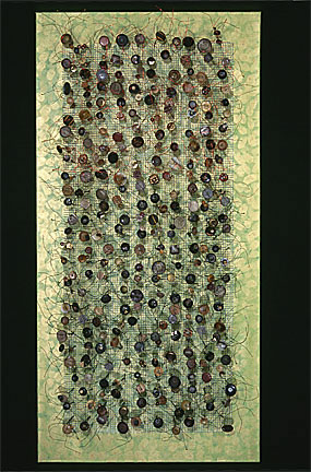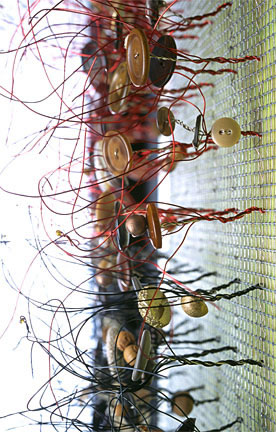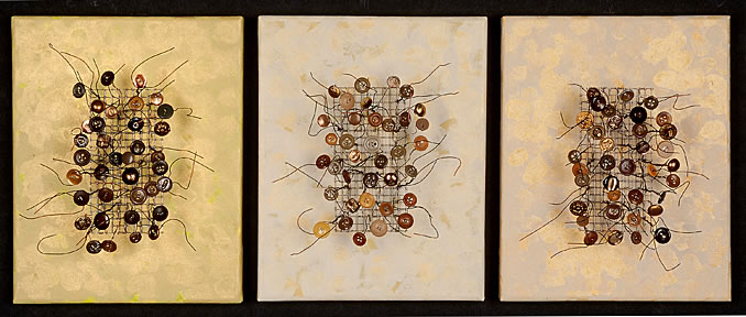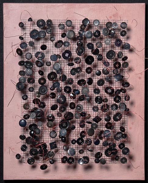 With my initial base in the fiber arts, which rely on the grid, I am interested in combining the order of the grid with the chaos of the buttons and wire. By combining and mixing, sewing and twisting, I have created a body of work that transforms the ordinary and celebrates the common.