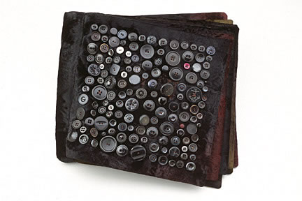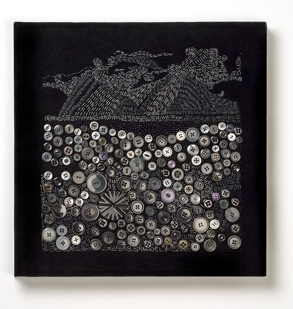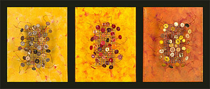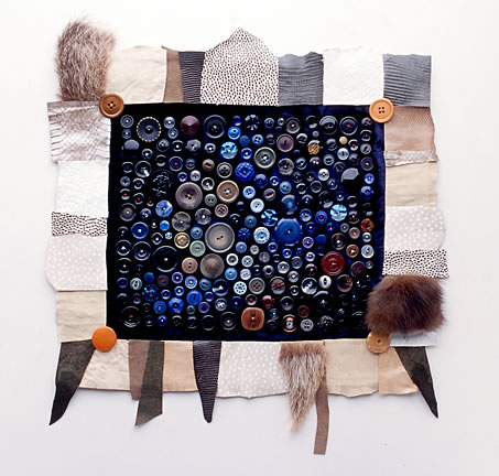 Sewn, pieced, woven, twisted and threaded, these button collages, 2-D and 3-D, have buttons from several generations of button boxes from my family and friends’ families, and buttons from anywhere and everywhere. I am reminded of mosaics, and of garments loved and un-loved, and the quilt-like intergenerational quality of these constructions.