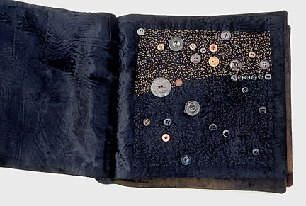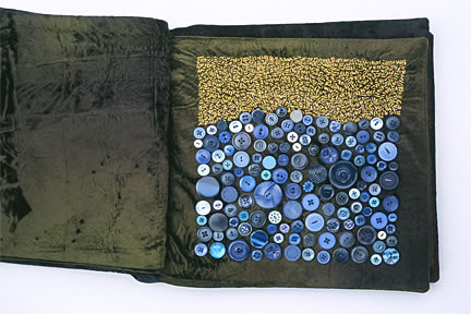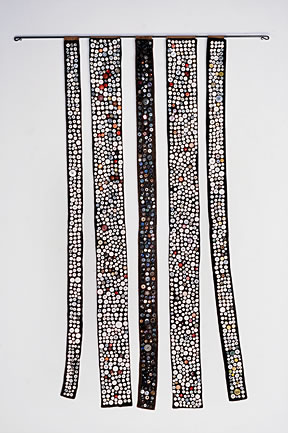 For the fabric pieces, buttons are carefully selected without pre-planning for the hand-sewing onto velvet. The velvet is then lined and hung, sometimes in groups. These pieces represent hours and hours of laborious spontaneity.