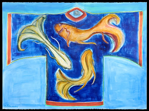 The paintings are mixed media on paper. I use acrylic paint, pastel, oil stick, pencil, and gesso. Several of the them include stamps, mylar, or buttons sewn onto the paper. The size of the paper (which is prepared with gesso) is either 44” x 30” or 30” x 22”.